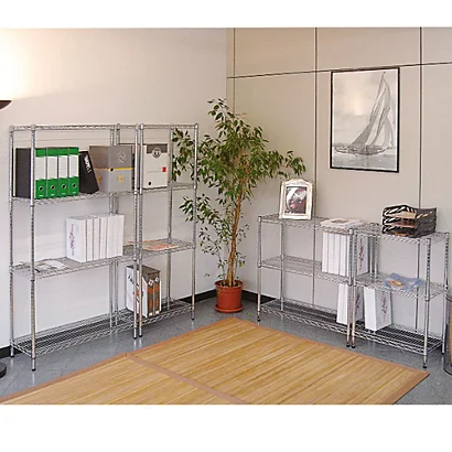- Struttura composta da tubi in acciaio cromato grigio e da 3 ripiani regolabili ad altezze diverse per gestire al meglio gli ingombri. I ripiani sono realizzati in filo d’acciaio, sono molto robusti e garantiscono una portata di 100 Kg. I piedini si possono regolare in altezza per la massima stabilità. Pratica e versatile, questa scaffalatura è completabile con il set 4 ruote (di cui 2 autofrenanti) per facilitarne lo spostamento. La scaffalatura è inoltre componibile per affiancamento grazie ai pratici ganci di collegamento.
